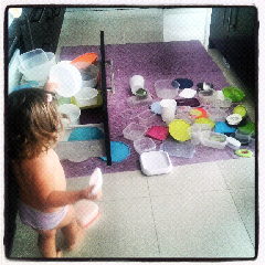 A lição de "em baixo, em cima" que me foi dada pela minha míuda gira há uns dias, foi aprendida com os caricas, assim como mais alguns sons de animais, alguns utensílios de cozinha.